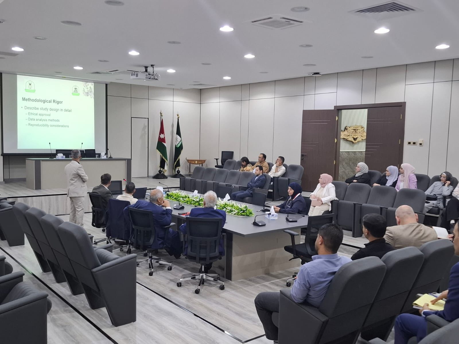 وأكد أ.د معاوية خطاطبة عميد البحث العلمي والدراسات العليا على خطوات البحث العلمي الرصينة مبيناً ابرز التحديات التي يواجهها الباحث