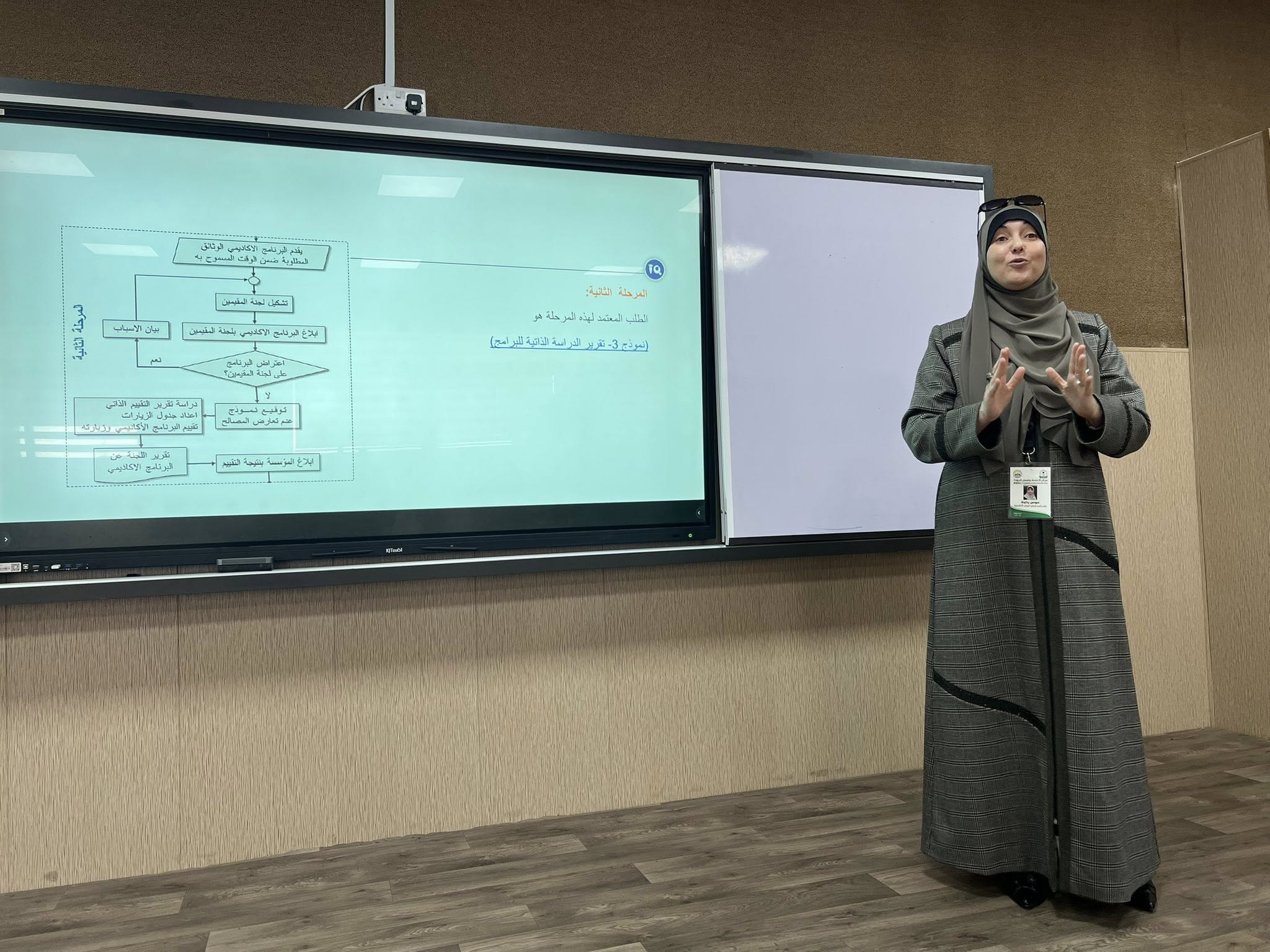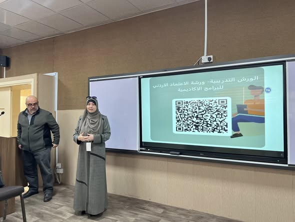 وقد قدمت الورشة المتميزة : سوسن ردايدة من مركز الاعتماد وضمان الجودة ؛ حيث بينت فيها الية العمل من قبل لجان الكلية من انجاز المهام وذلك للحصول على الاعتماد الاردني للبرامج الاكاديمية في الكلية