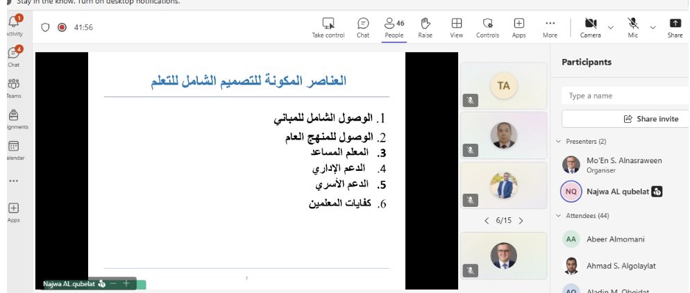 وجاءت الورشة بتنسيق من الأستاذة الدكتورة آمال الزعبي و الدكتور معين نصراوين، حيث هدفت إلى تعزيز فهم المشاركين لمفهوم التصميم الشامل للتعلّم، وتسليط الضوء على أهميته في بناء بيئات تعليمية مرنة تستجيب للفروق الفردية وتدعم التعلّم المتمايز. كما تناولت الدكتورة قبيلات خلال الورشة المبادئ الأساسية للتصميم الشامل للتعلّم، وآليات دمجه في التخطيط التعليمي، إضافةً إلى أمثلة تطبيقية تساعد المعلمين على تحسين ممارساتهم التدريسية بما يسهم في دعم مشاركة جميع الطلبة بفاعلية.وشهدت الورشة حوار تفاعلي أجاب خلاله القائمون على الورشة عن أسئلة المشاركين، مؤكدين استمرار الكلية في تنفيذ أنشطة تدريبية نوعية تُعزّز التطوير المهني في الميدان التربوي. وفي نهاية الورشة قدم الأستاذ الدكتور هاني عبيدات عميد كلية العلوم التربوية مداخلة أكد فيها القيمة المنتظرة للتصميم الشامل في مجال توفير فرص وصول جميع الطلبة إلى التعليم وتصميم بيئات تعليمية وخطط دراسية وأنشطة وأدوات متنوعة.